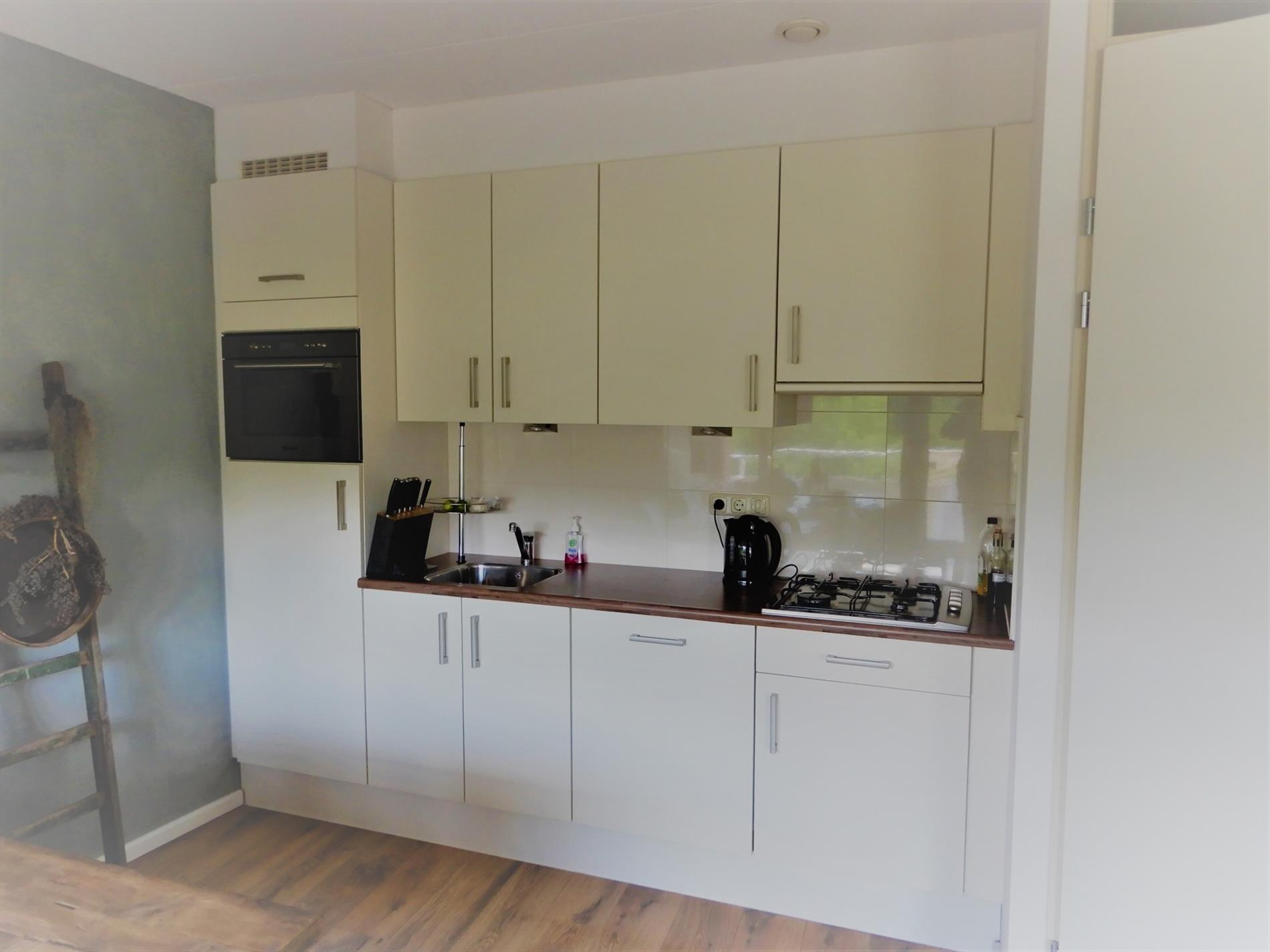 Keuken met inbouwapparatuur t.w. koelkast, gaskookplaat, afzuigkap, vaatwasser, combi magnetron oven.