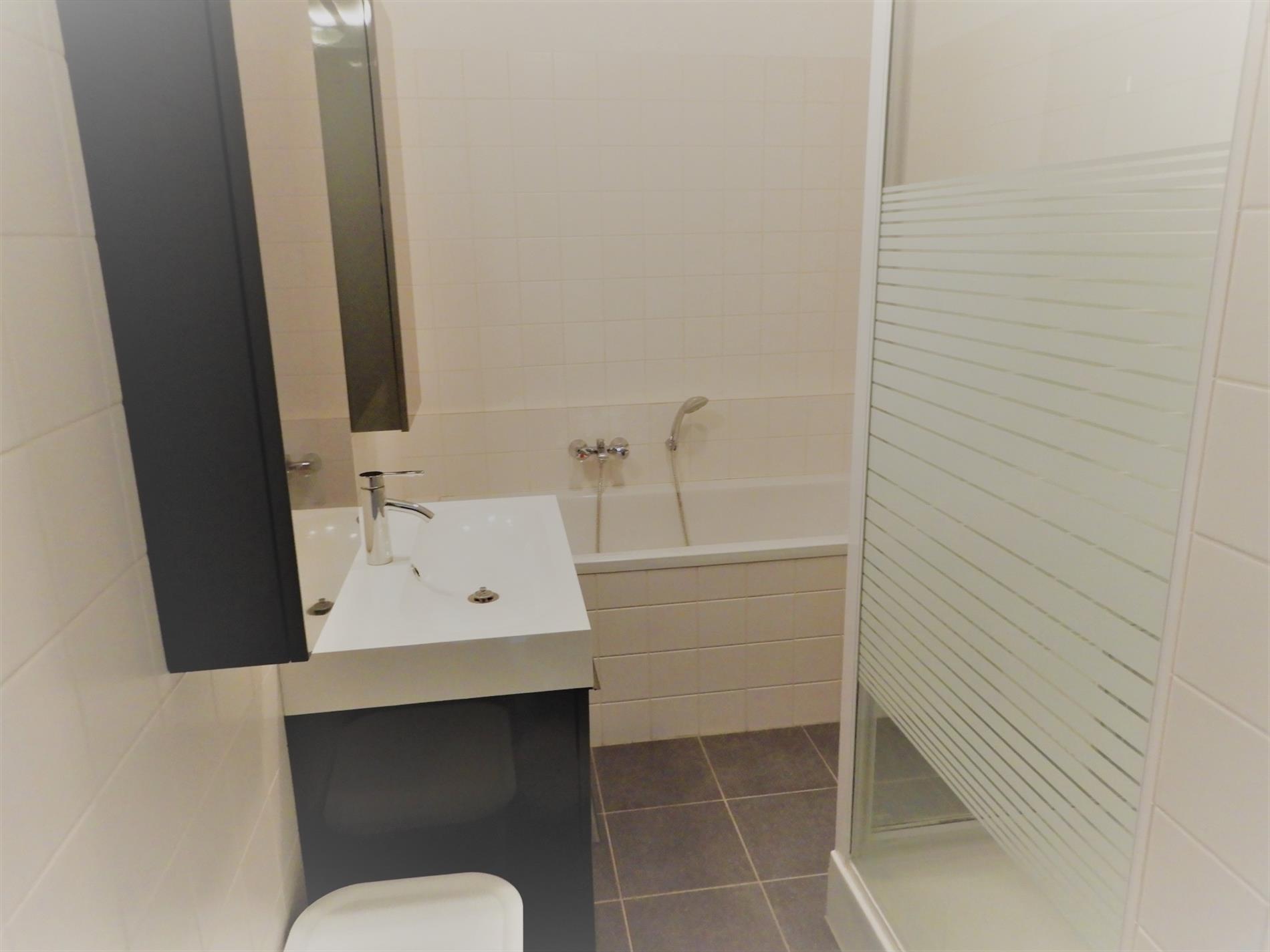 Badkamer met ligbad, douche en wastafel.