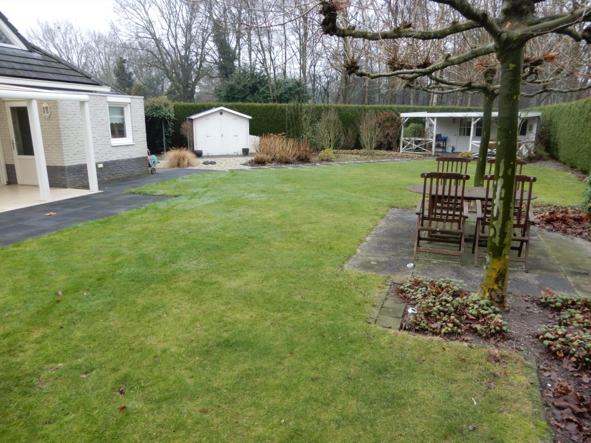 Tuin met achterom met poort, 2x tuinberging, overdekt terras.