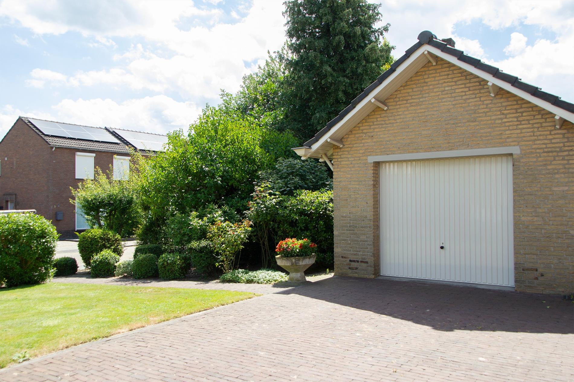 Garage in spouwmuren, vliering, dak gedekt met pannen. Aangebouwde hobbyruimte in spouwmuren en uitstortgootsteen, puls met pomp, elektrisch bediende garagedeur, bitumen gedekt. Totaal garage en hobbyruimte circa 41 m2.