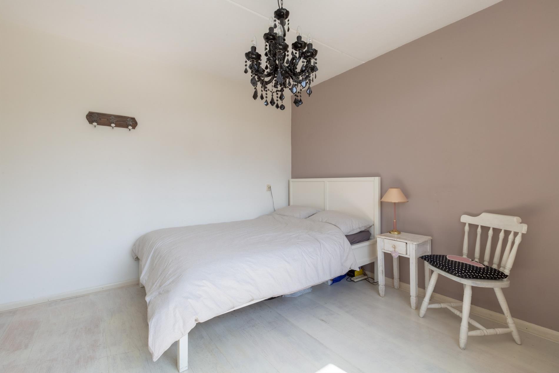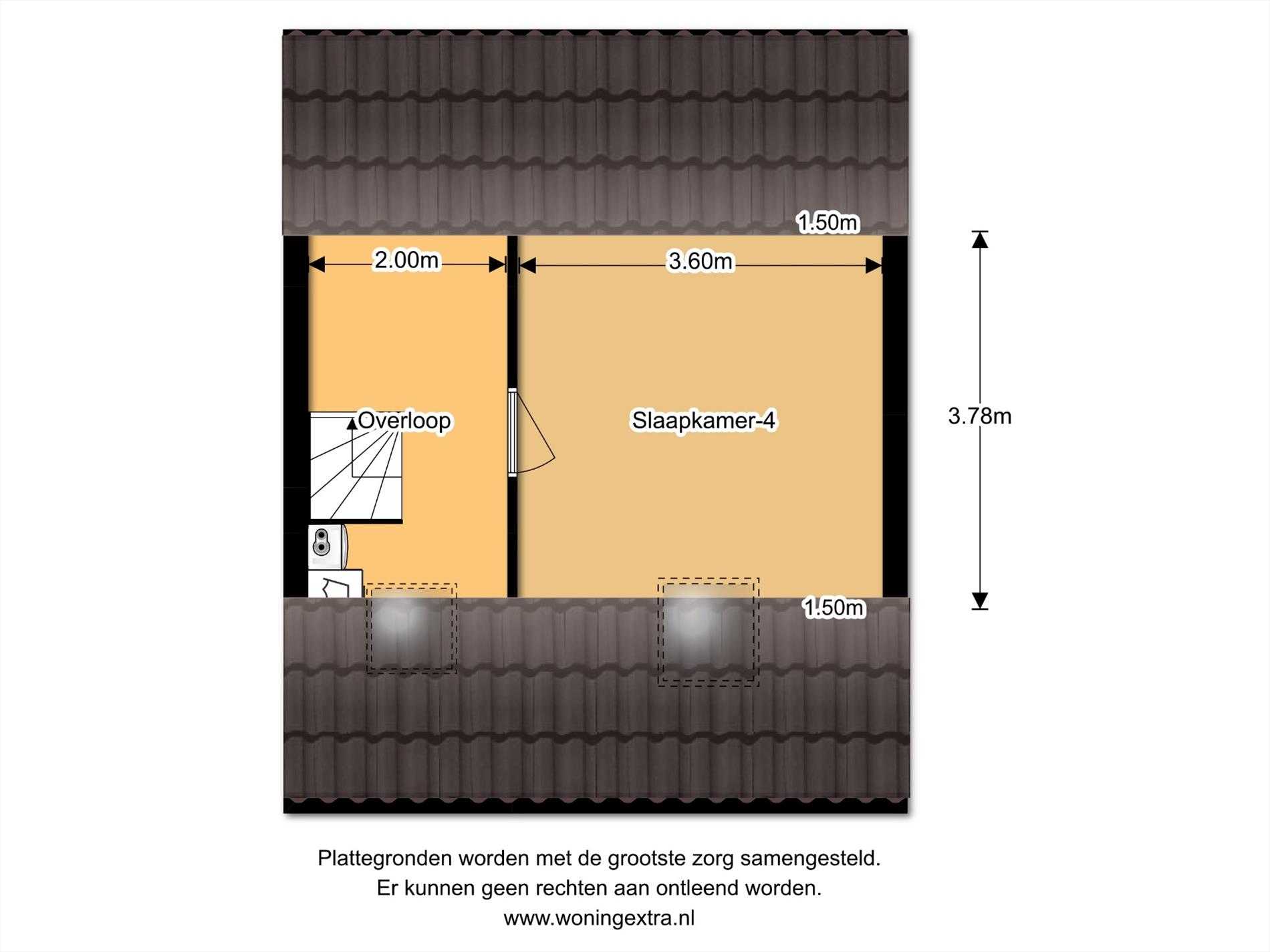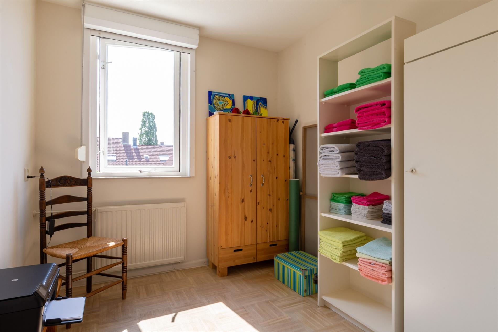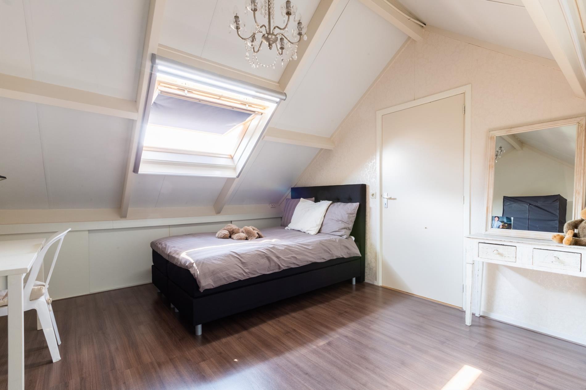 Zolderkamer met laminaat, Velux dakvenster, inbouwkast en bergruimte in de schuinte.