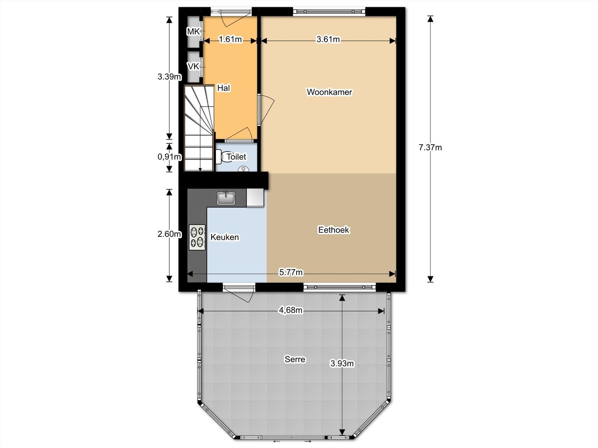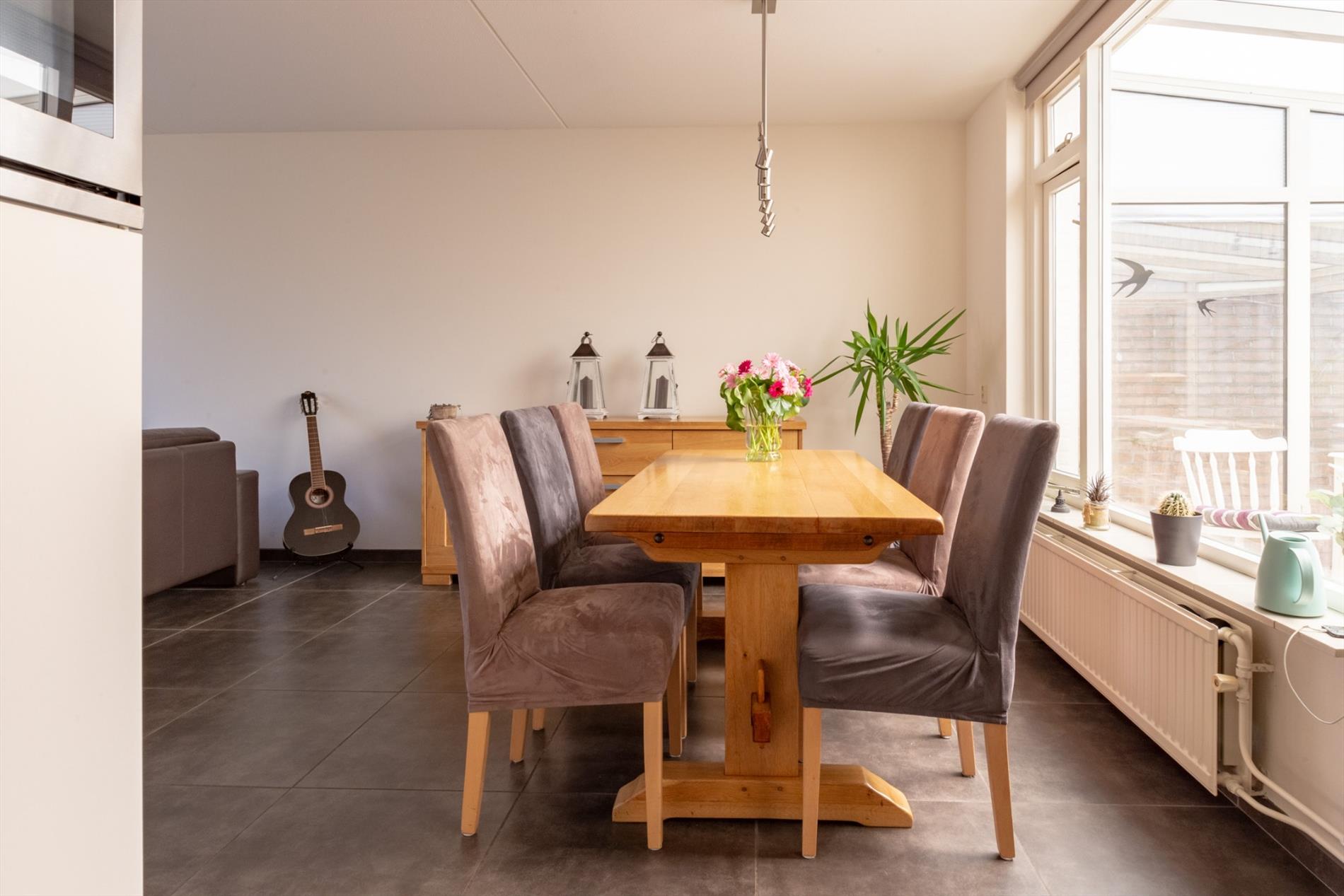 Woonkamer type doorzon met open keuken. Begane grond plavuizen..