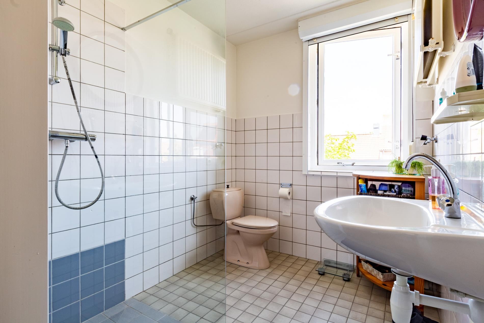 Badkamer met douche met glaswand, 2e toilet, wastafel.