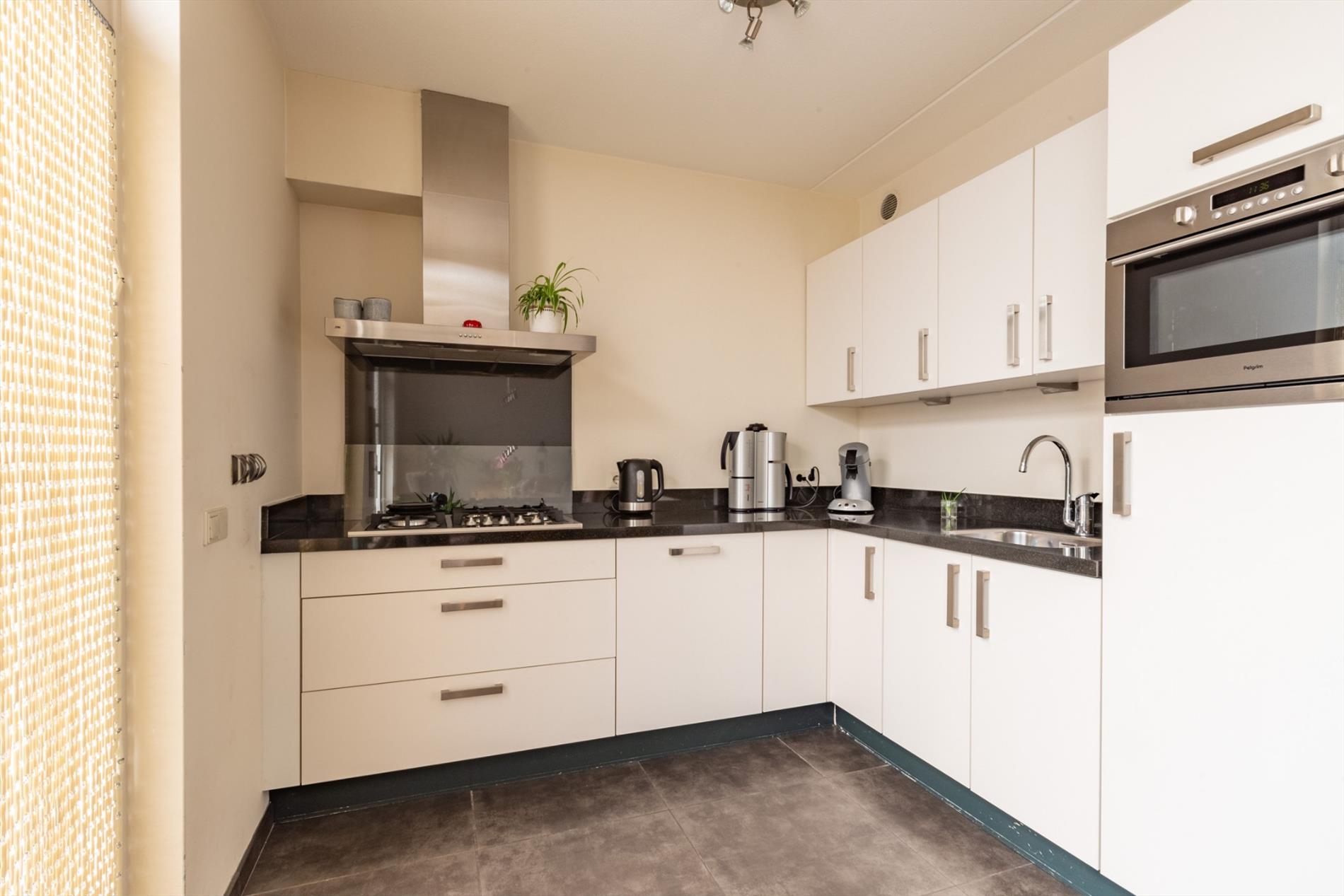 Keuken L opstelling met inbouwapparatuur circa 2012 t.w. kookplaat, afzuigkap, koelkast, combi magnetron, vaatwasser.