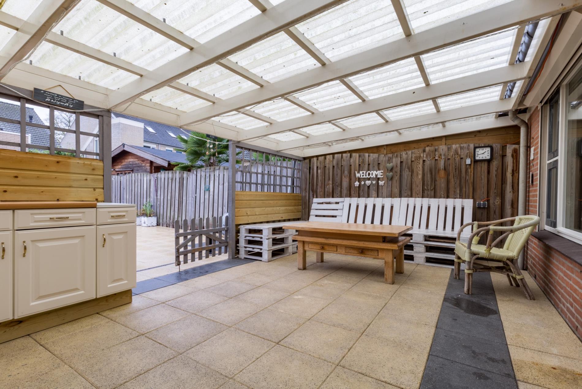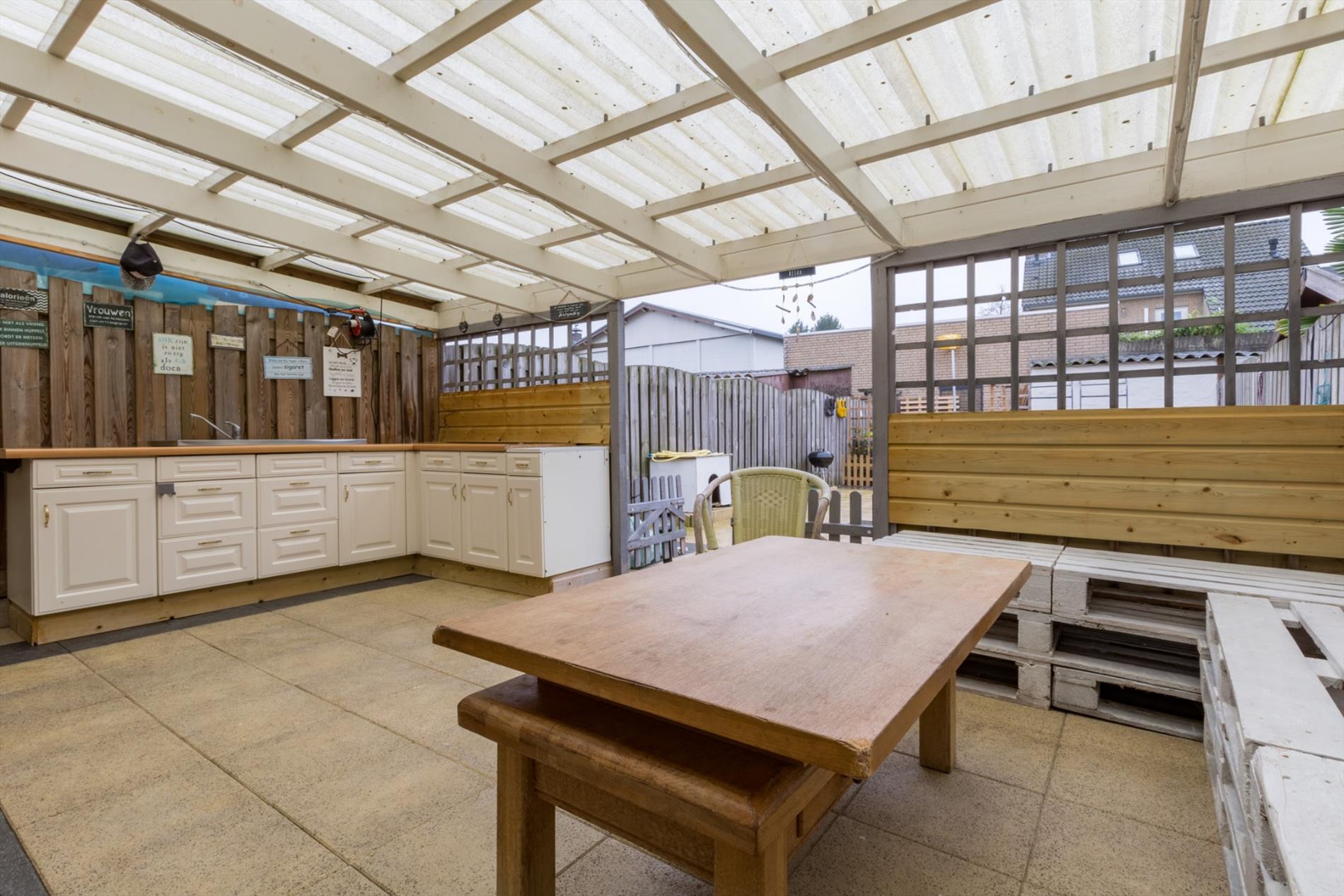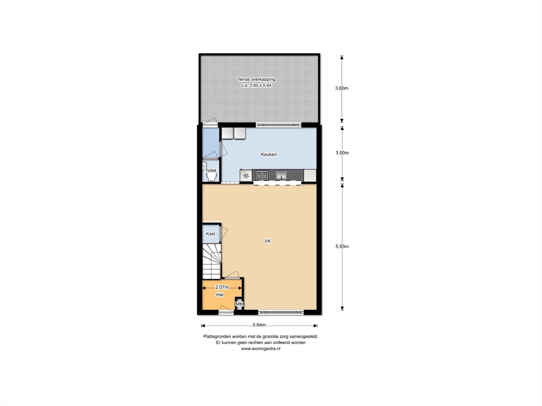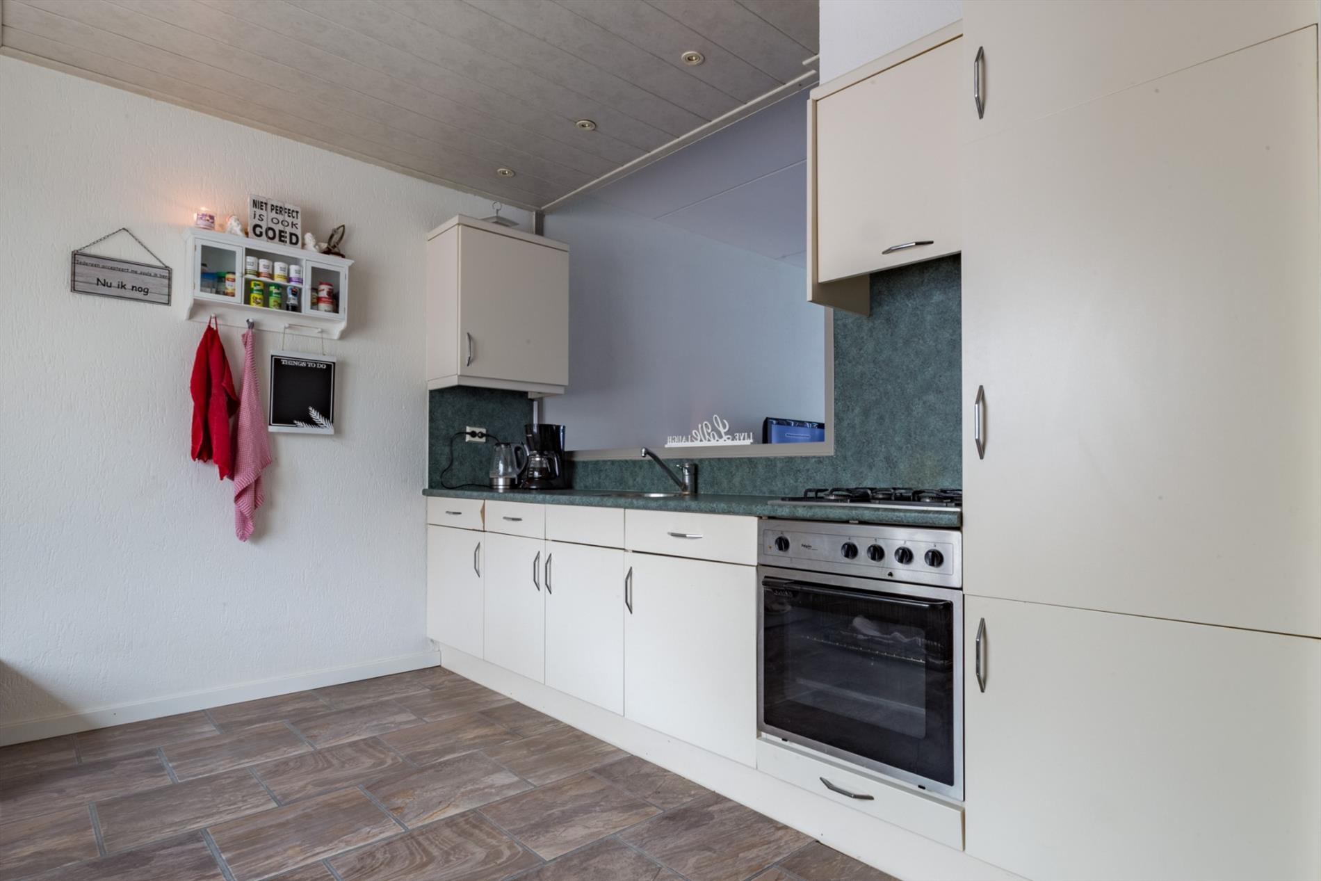 Keuken: circa 13 m2, eenvoudig recht keukenblok met oven, kookplaat, afzuigkap, koelkast en losse kast, inbouwspots, Laminaat vloer.