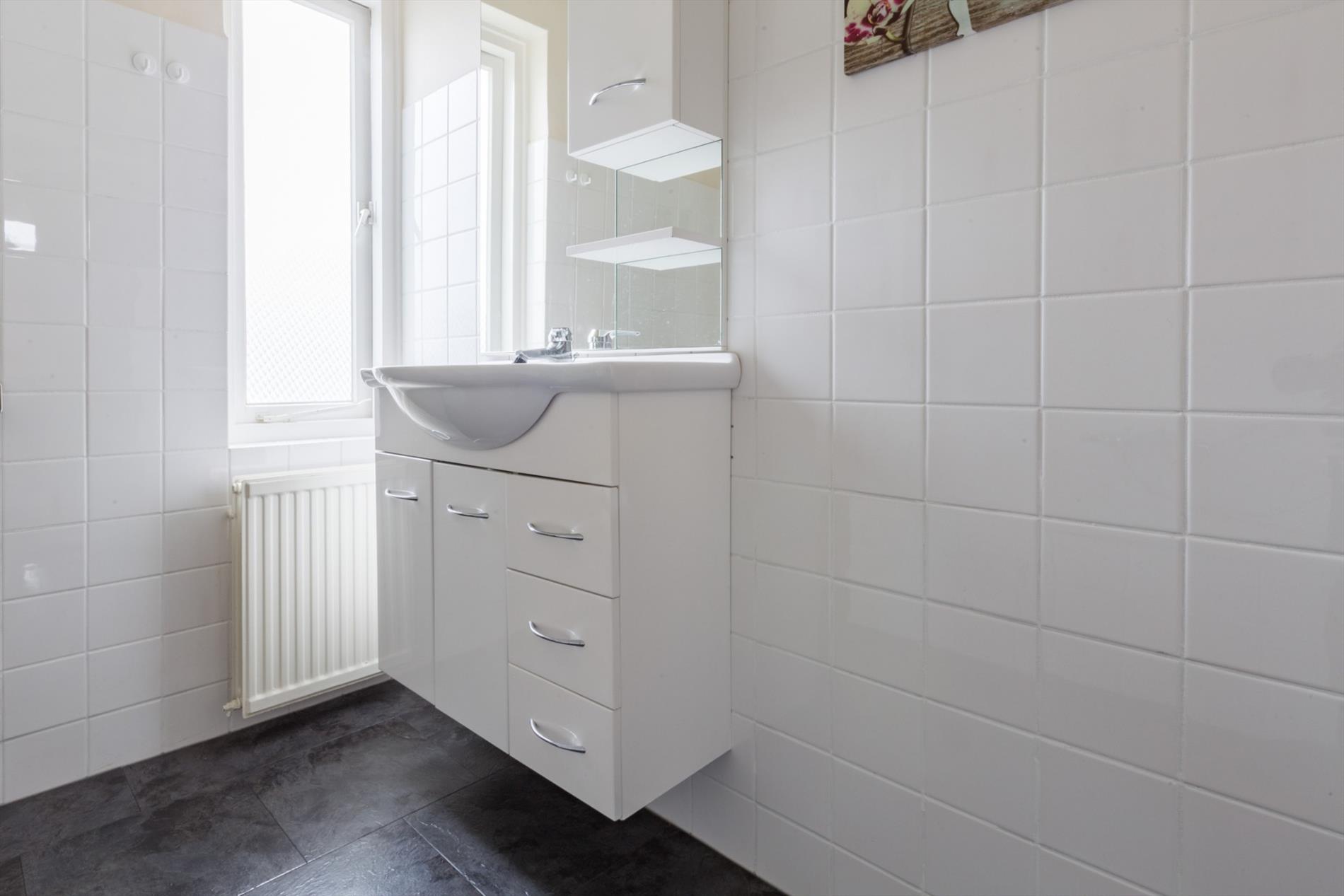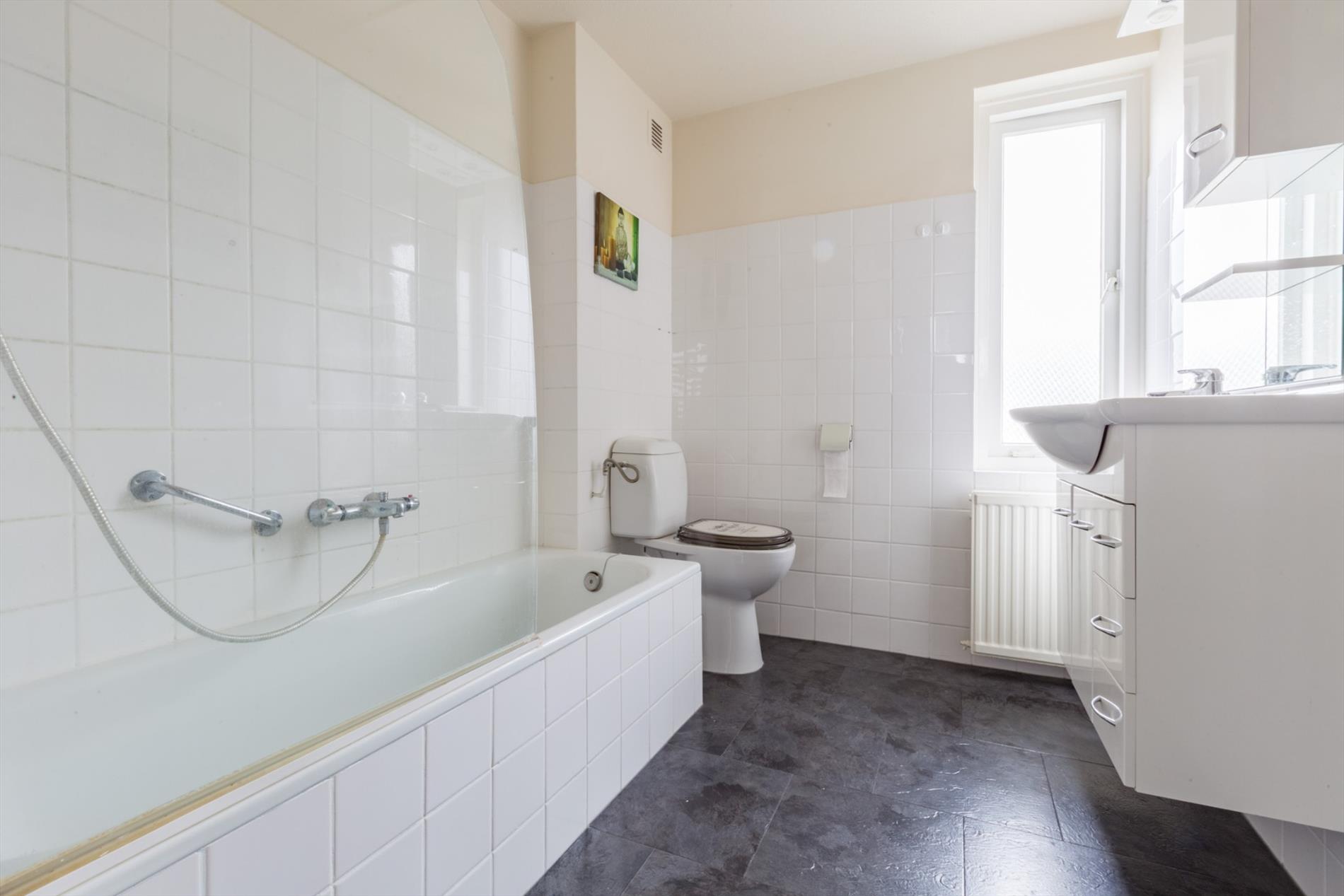 Badkamer: circa 5 m2, links achter ligbad met scherm, toilet, wastafel met ombouw, tegelwerk 180+