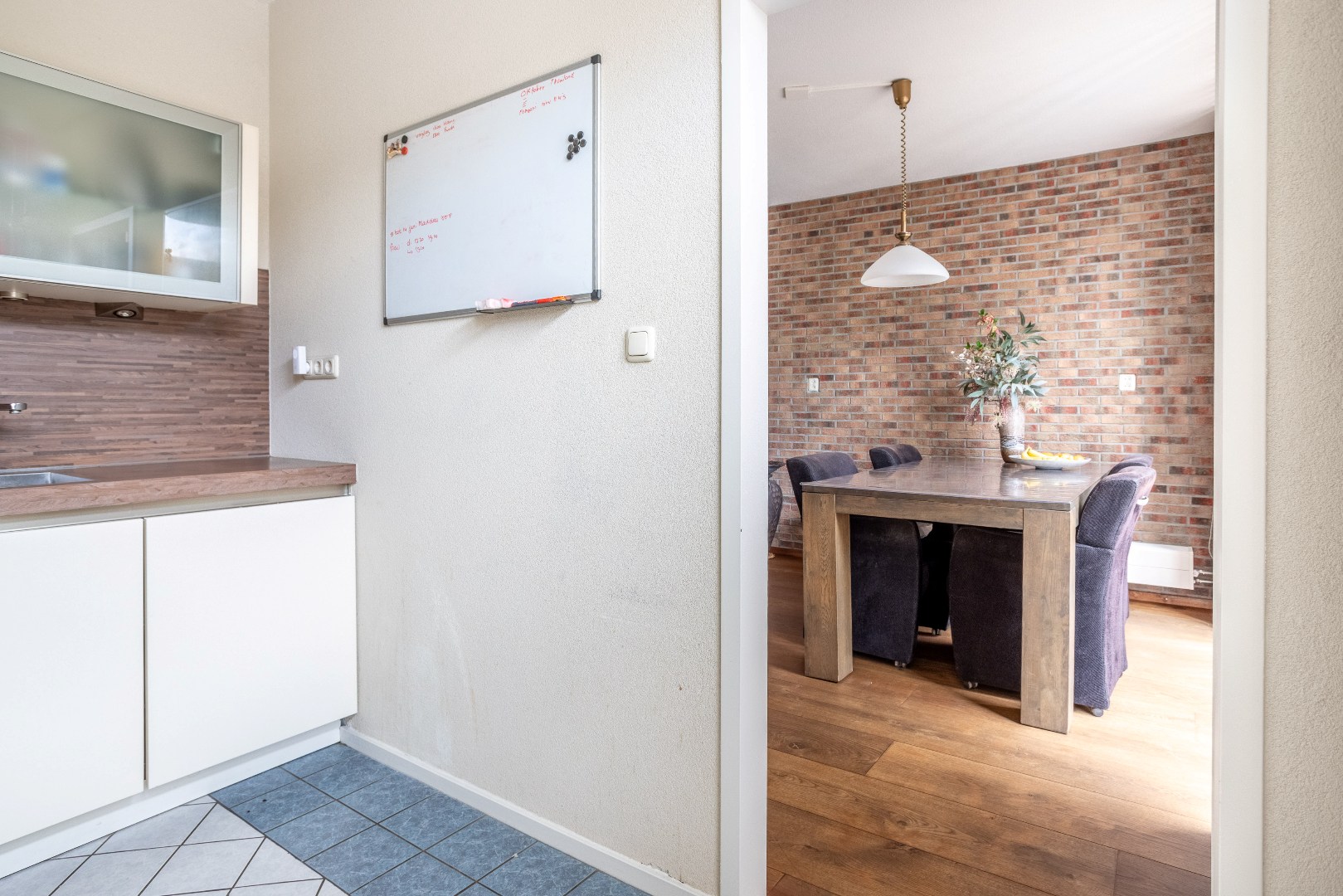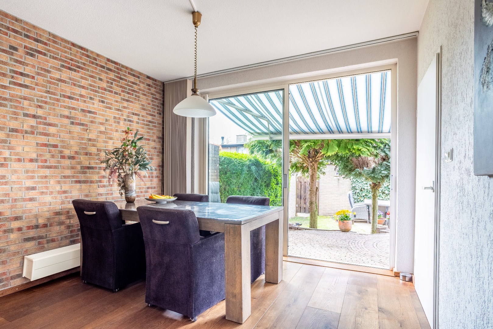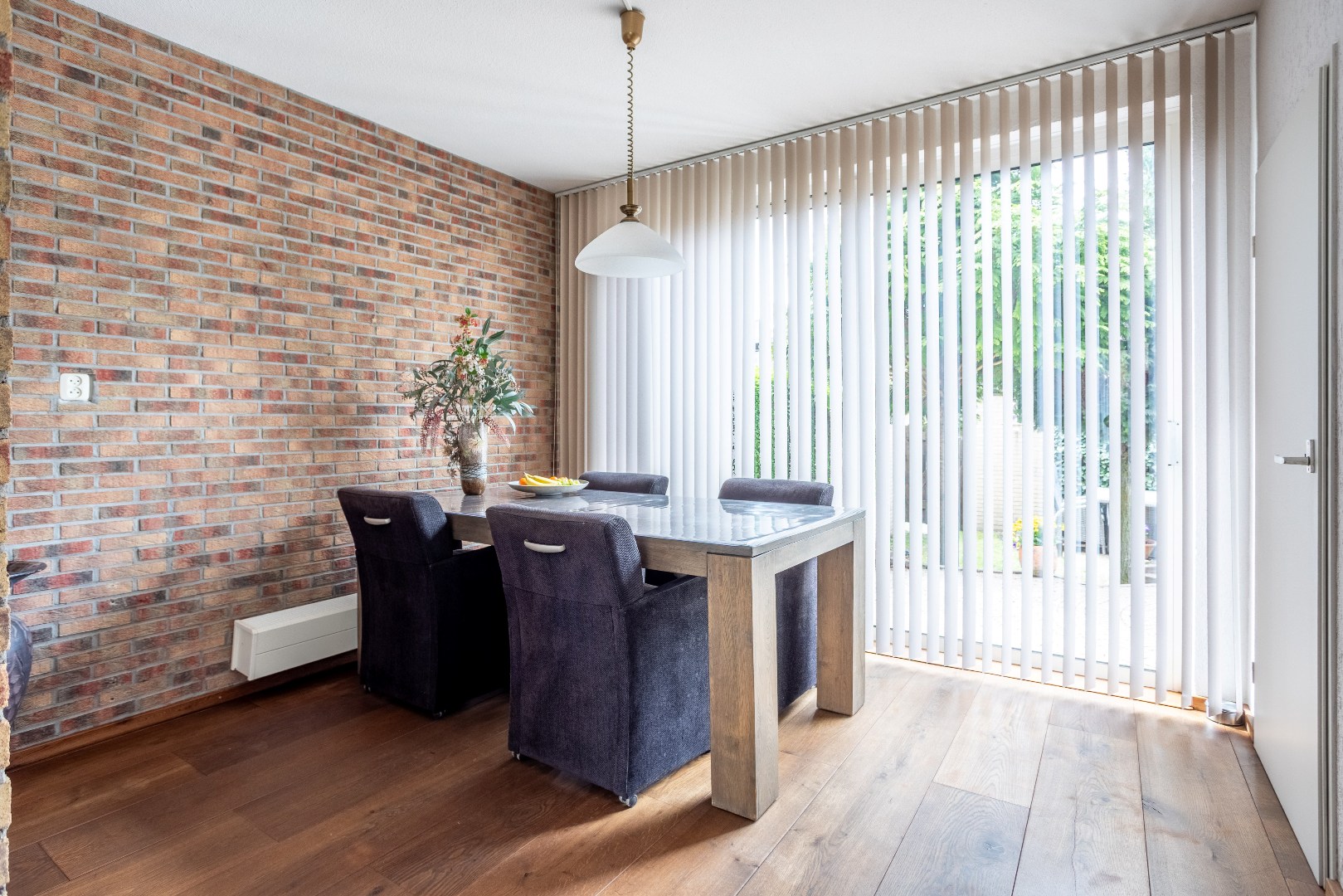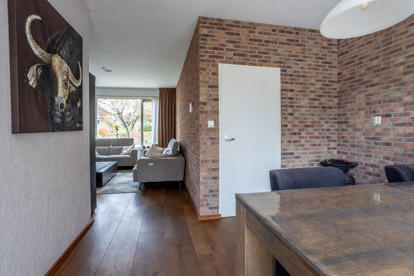 Woonkamer Z indeling met zit en eetgedeelte, massieve houten vloer.