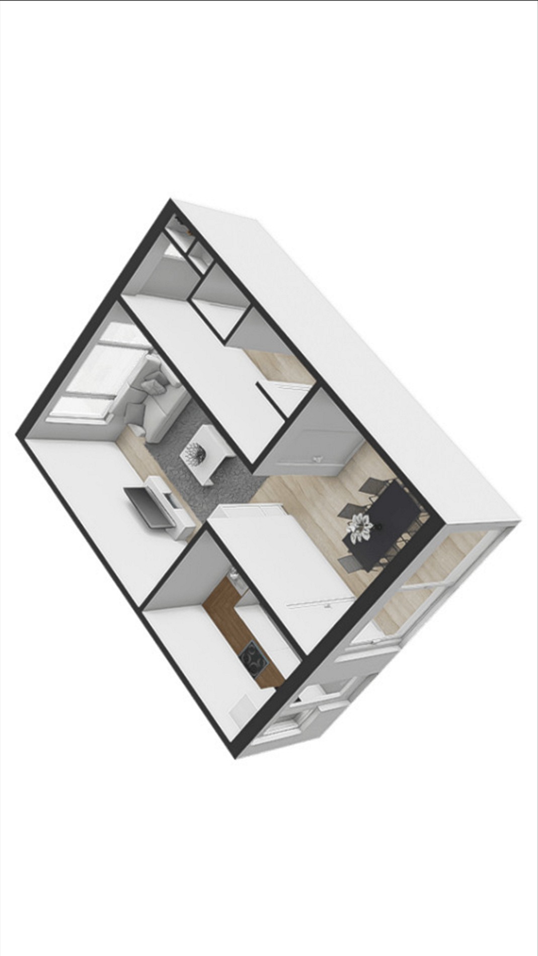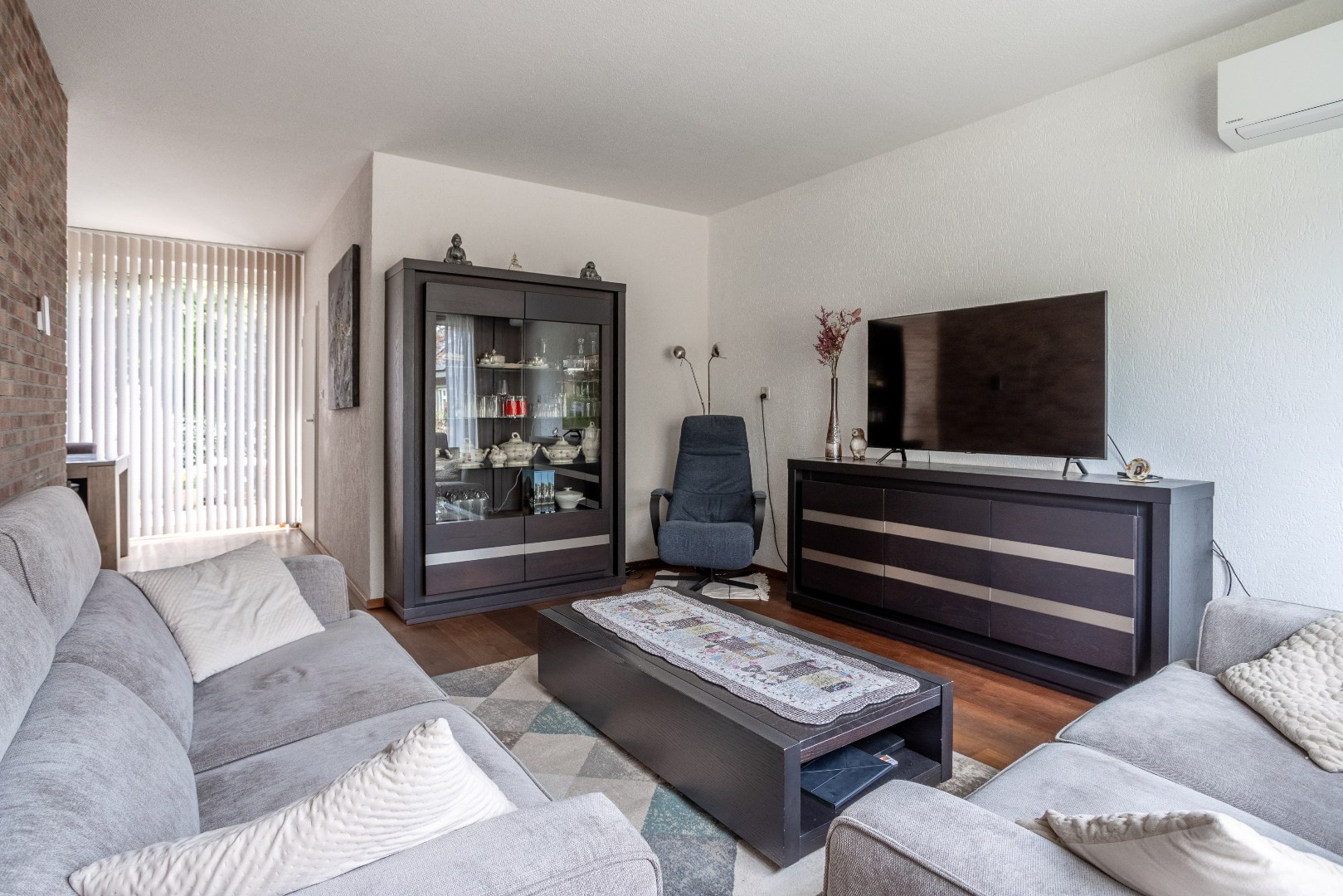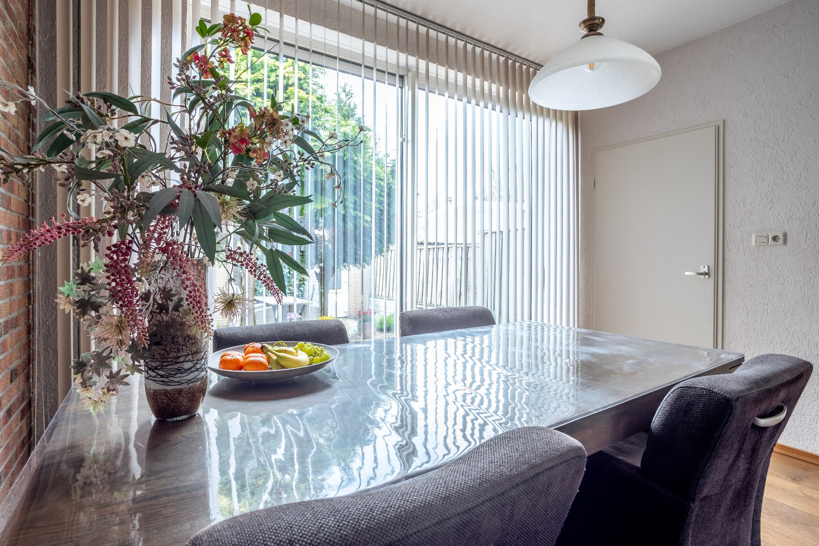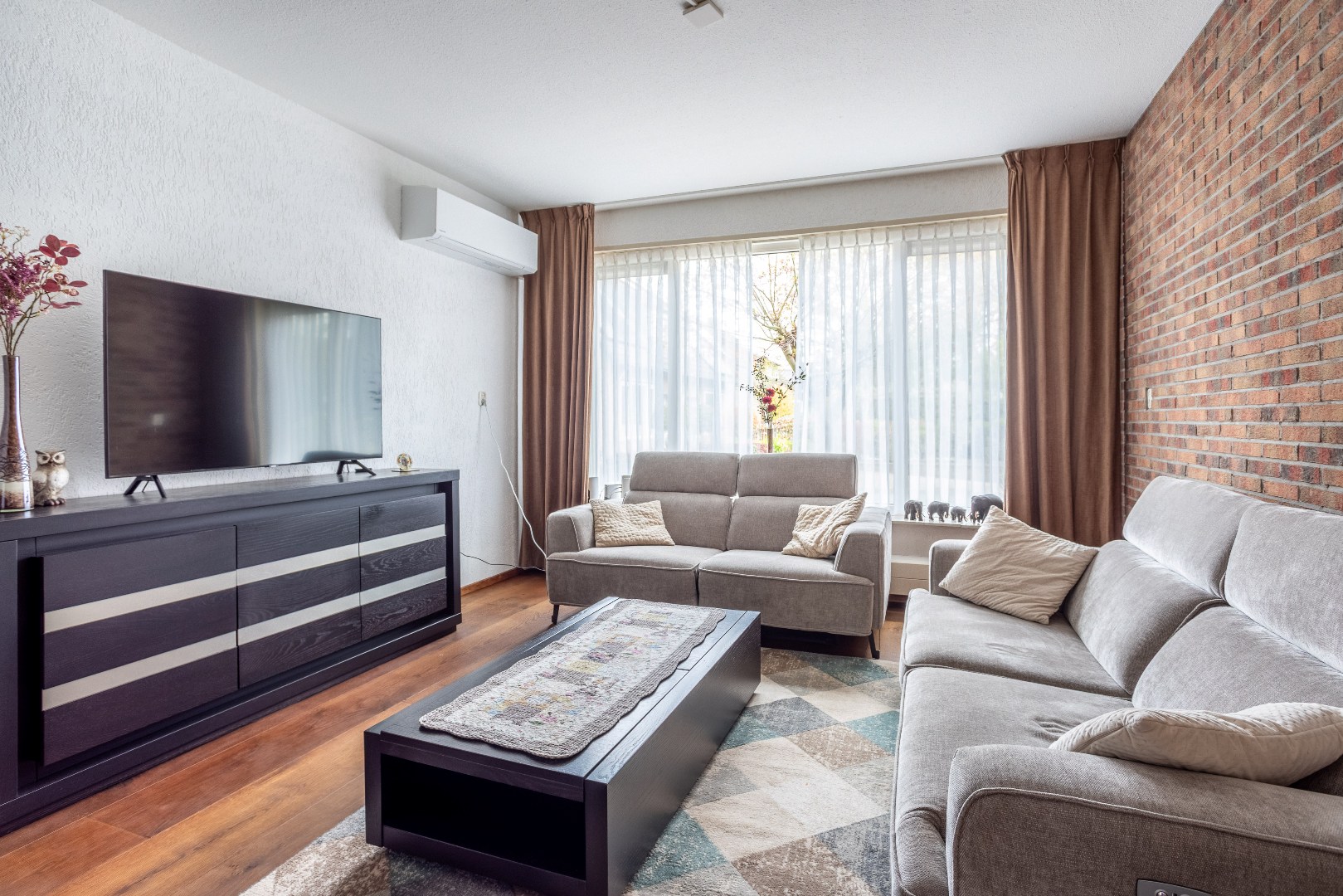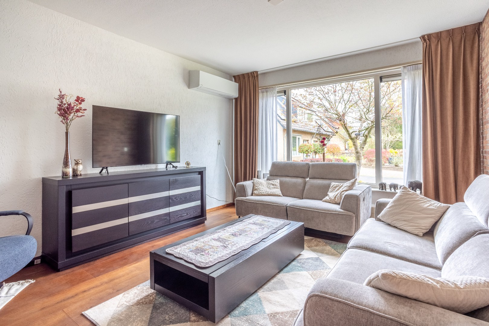 Woonkamer Z indeling met zit en eetgedeelte, massieve houten vloer.