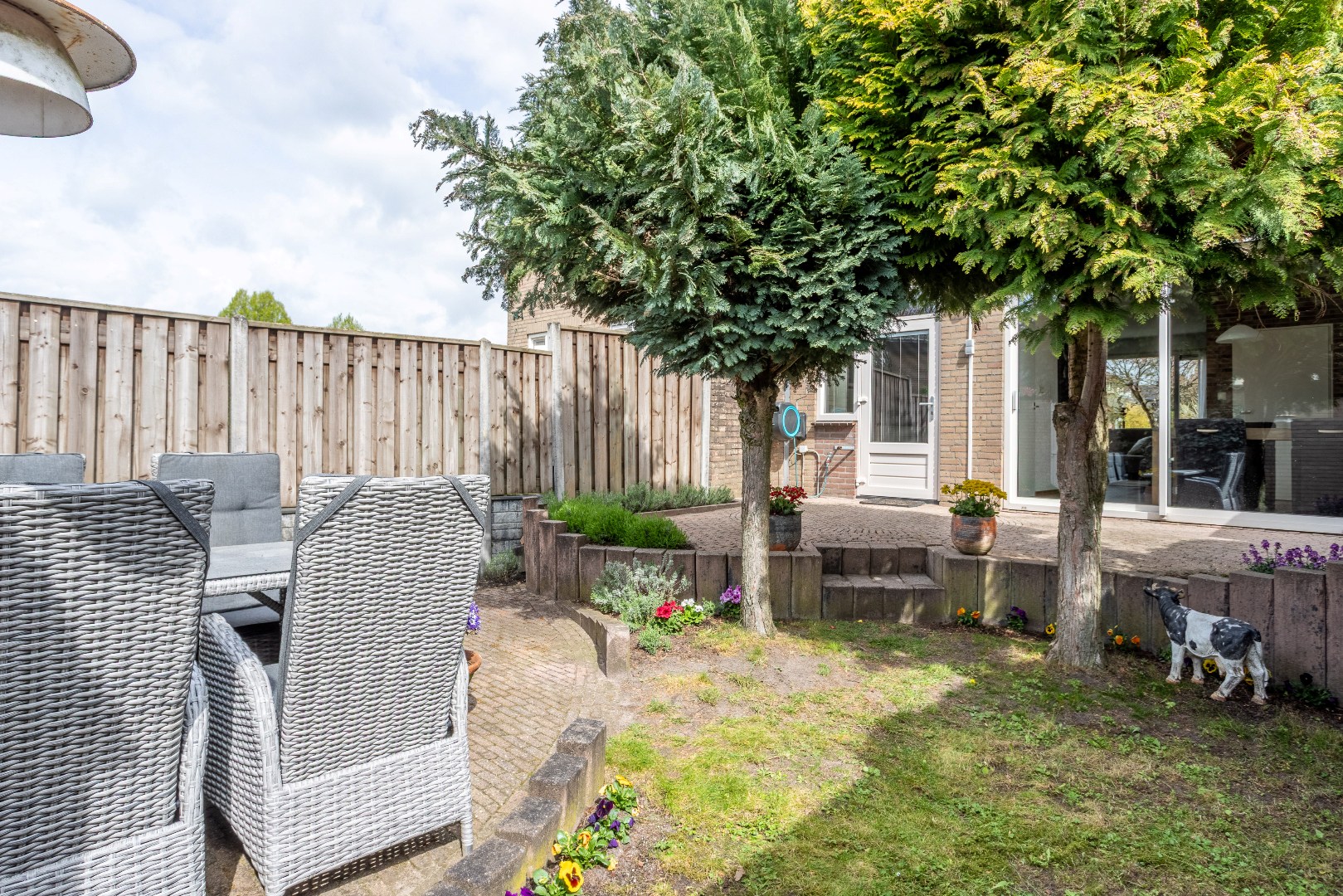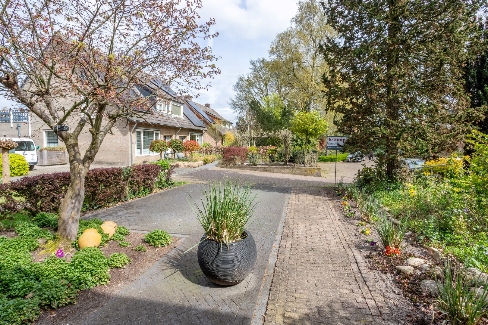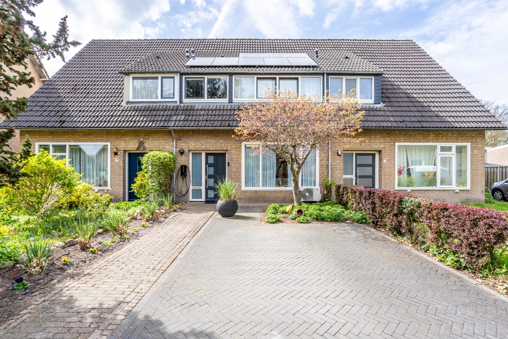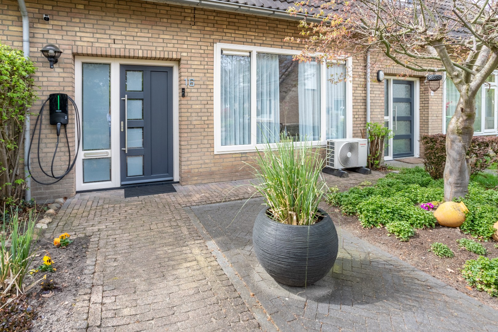 Buiten: voortuin met parkeerplaats en laadpunt t.b.v. elektrische auto.