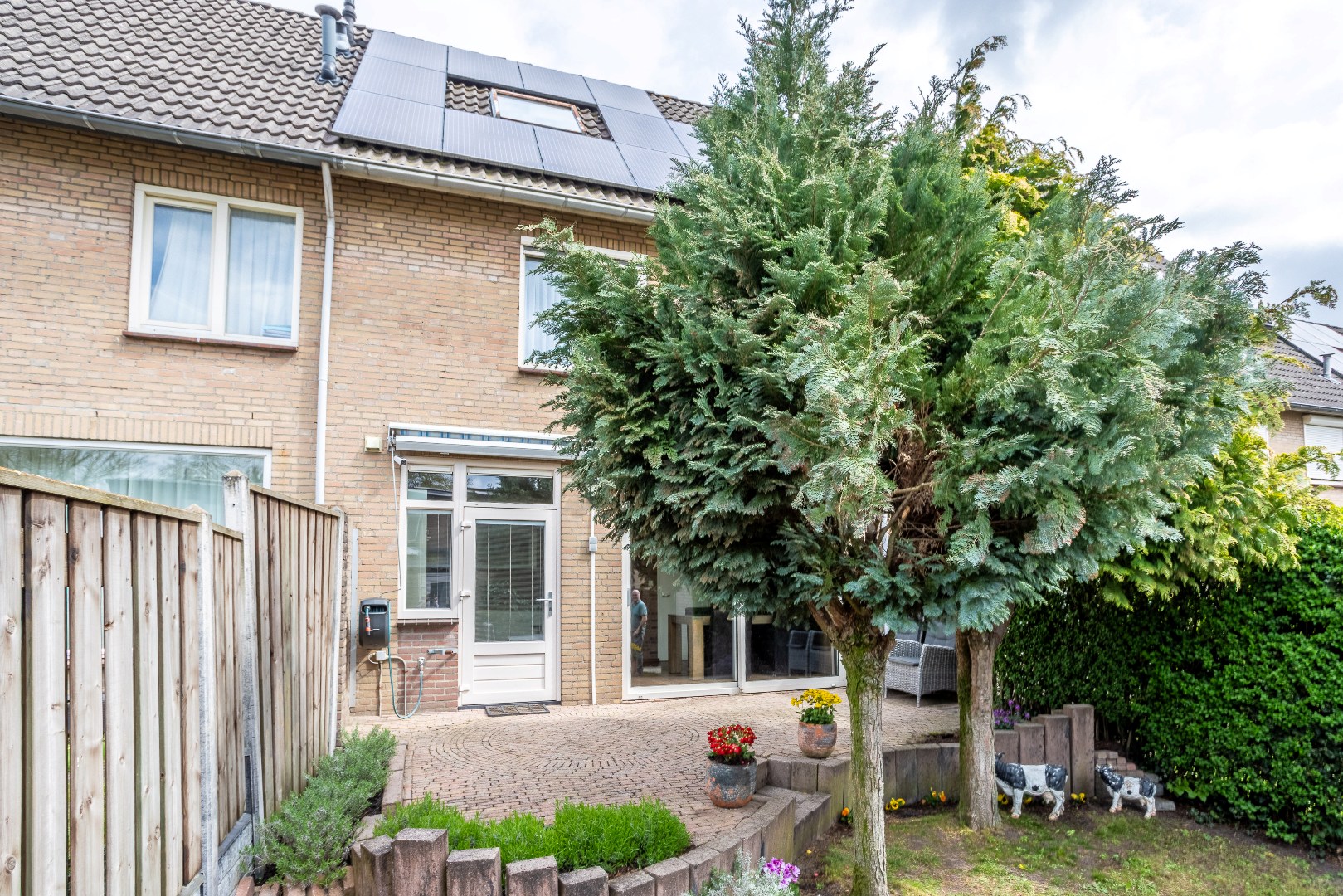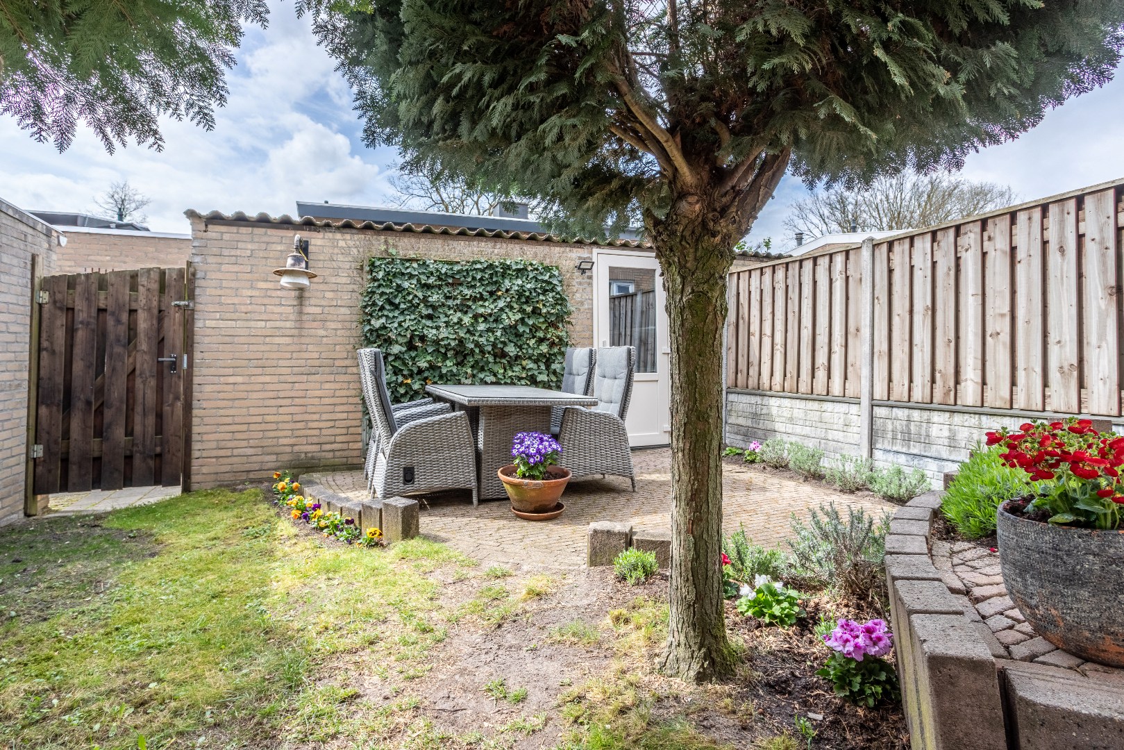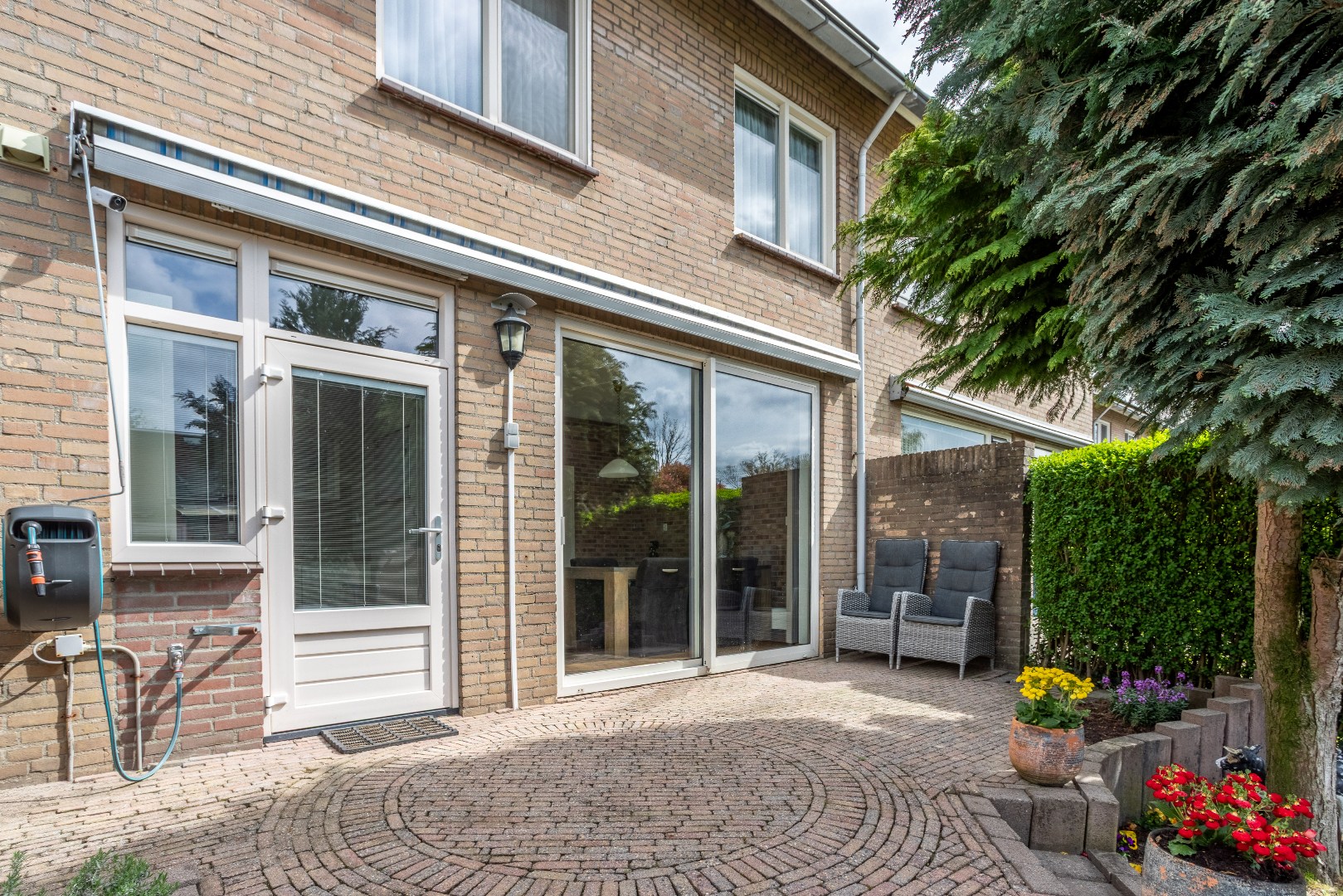 achtertuin: terras, zonnescherm, berging en achterom. Gelegen op zuid--west.