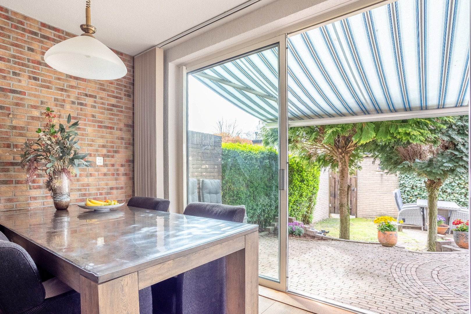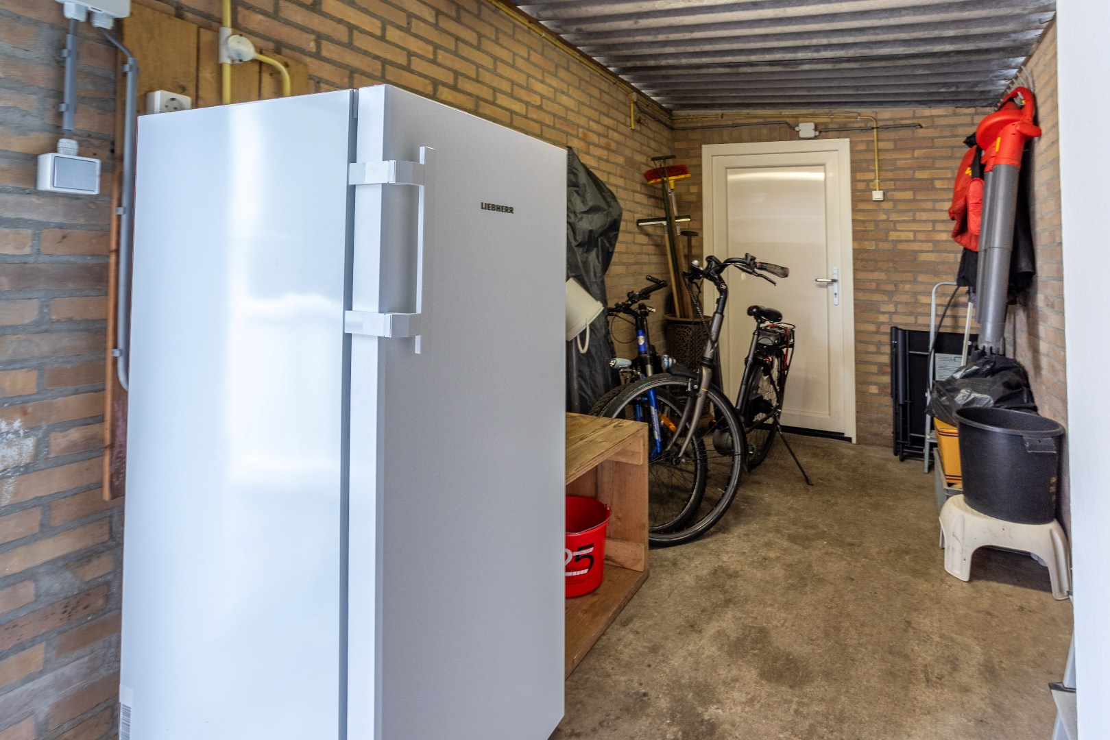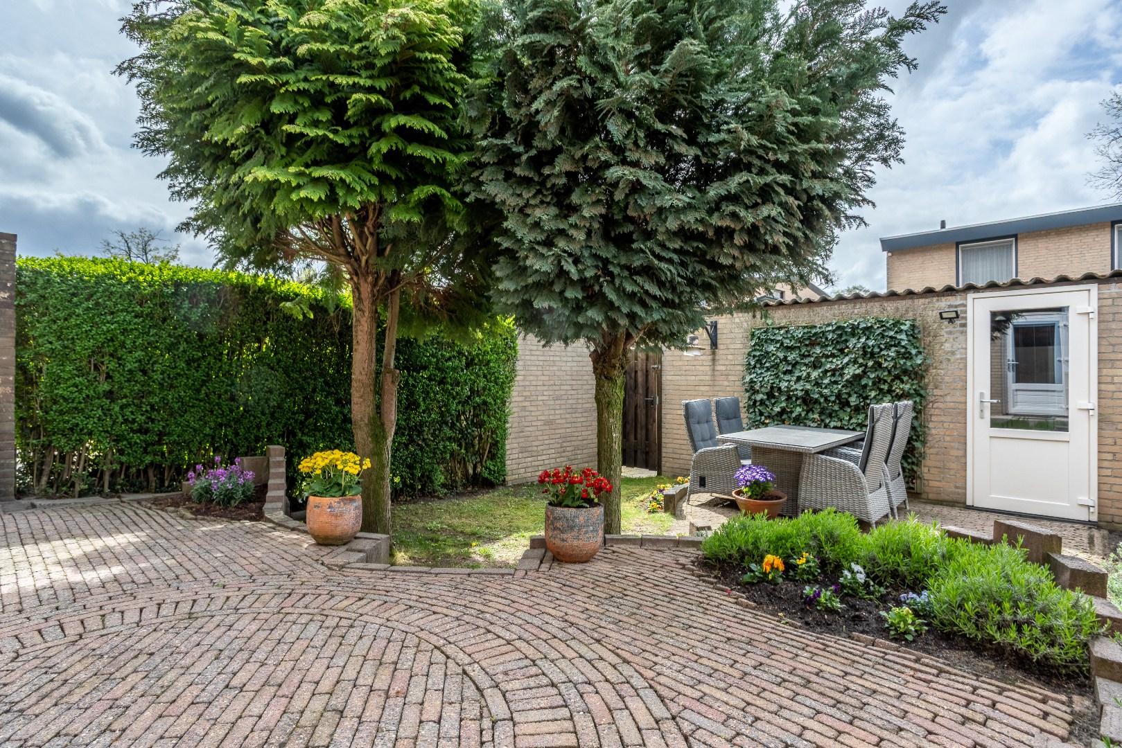 achtertuin: terras, zonnescherm, berging en achterom. Gelegen op zuid--west.