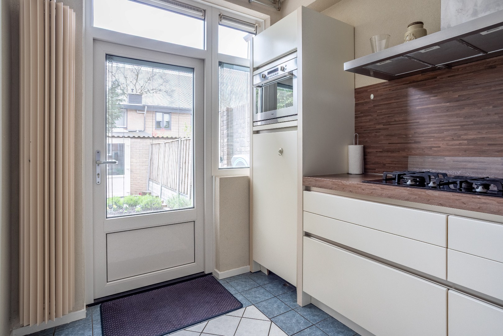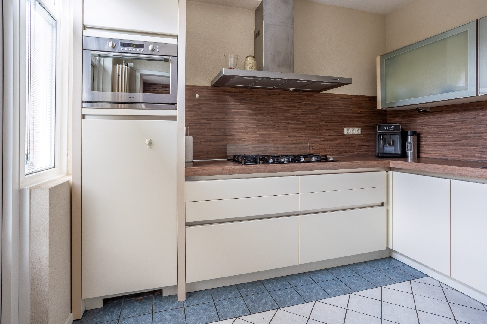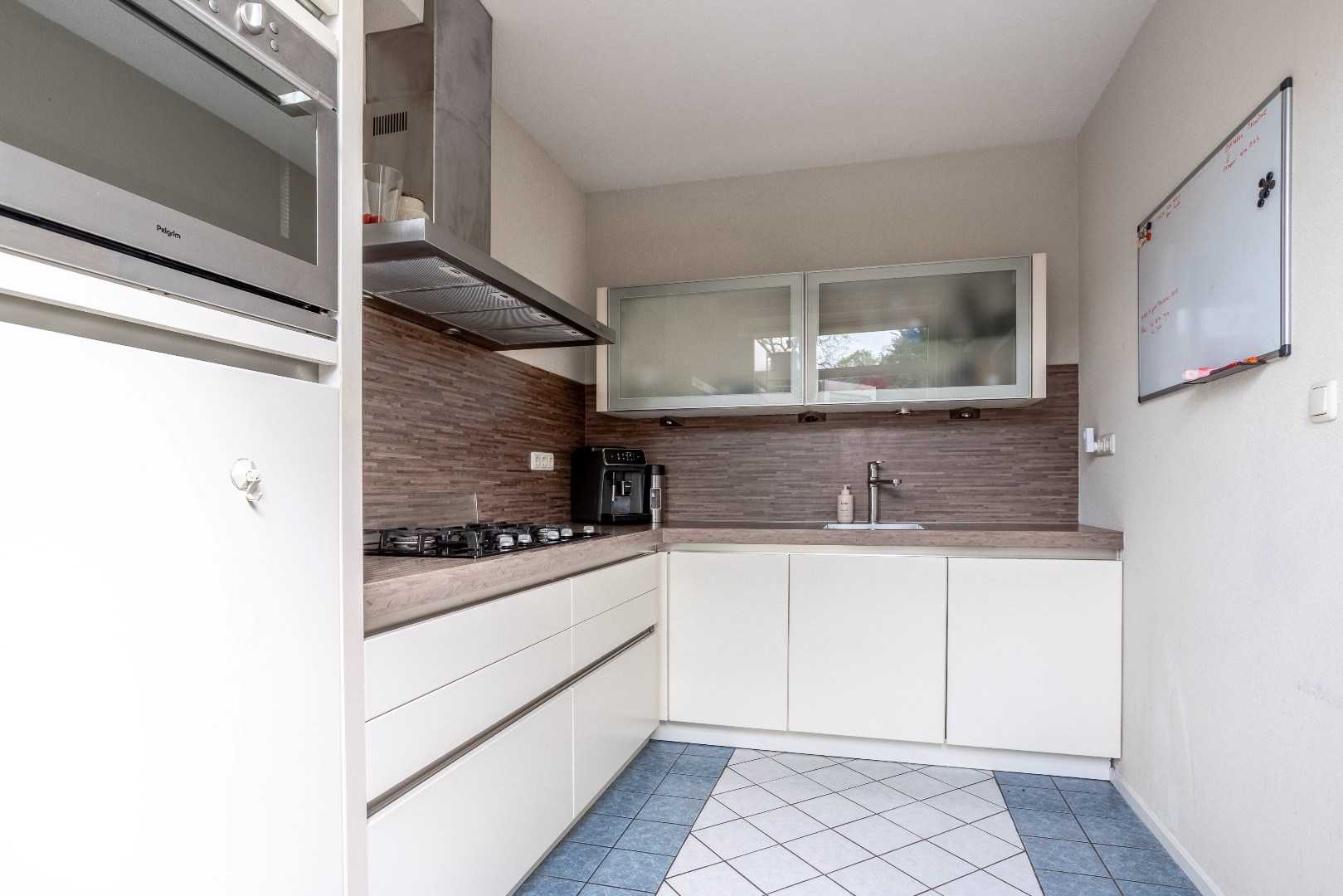 Dichte keuken met L opstelling en inbouwapparatuur t.w.: 5 pits gaskookplaat, brede afzuigkap, vaatwasser en koelkast.