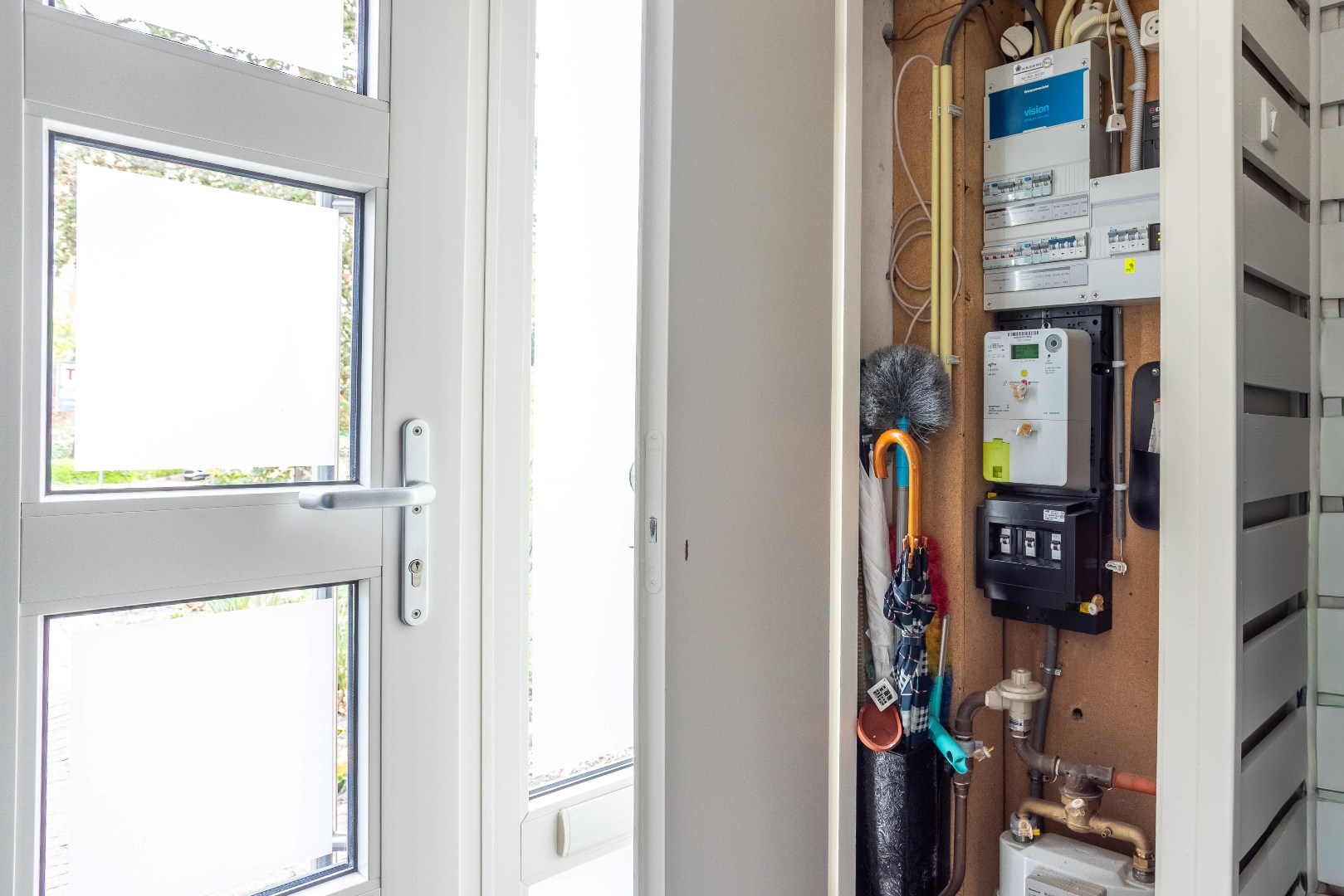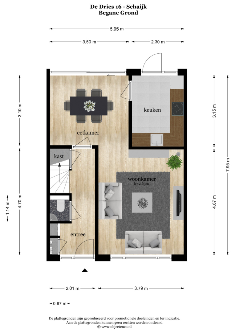 Indeling begane grond: hal met meterkast 3x 25 amp., verdiepingstrap en toilet.