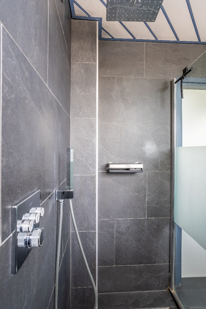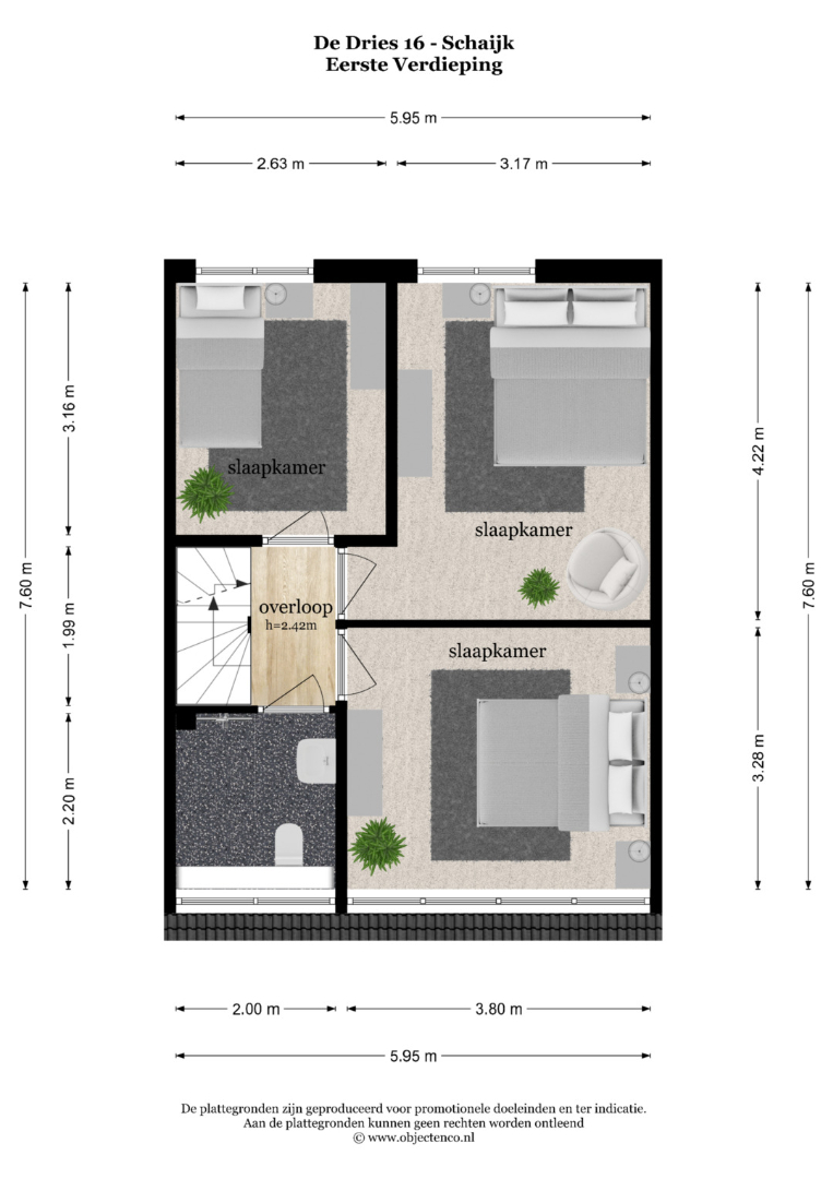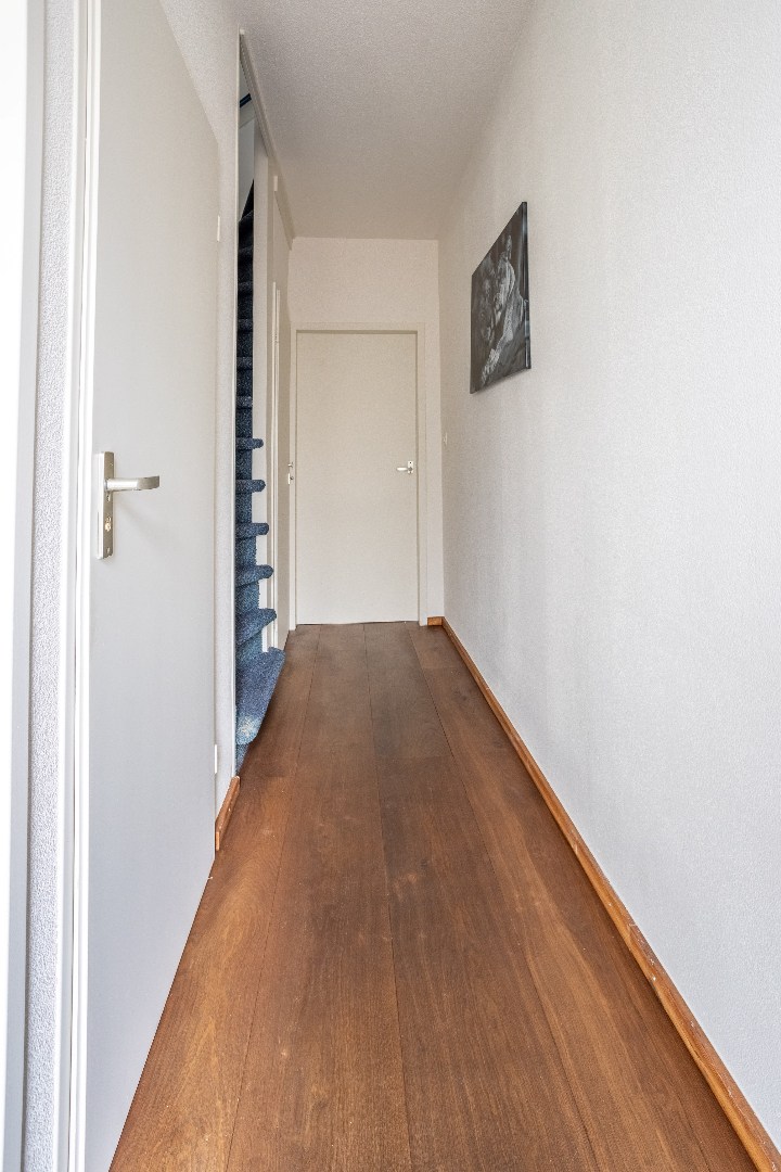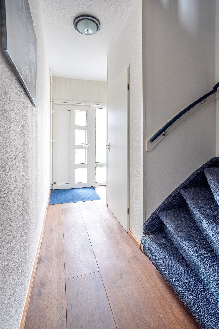1e verdieping: overloop met vaste trap naar 2e verdieping, 3 slaapkamers, badkamer met inloopdouche, wastafel en 2e toilet.