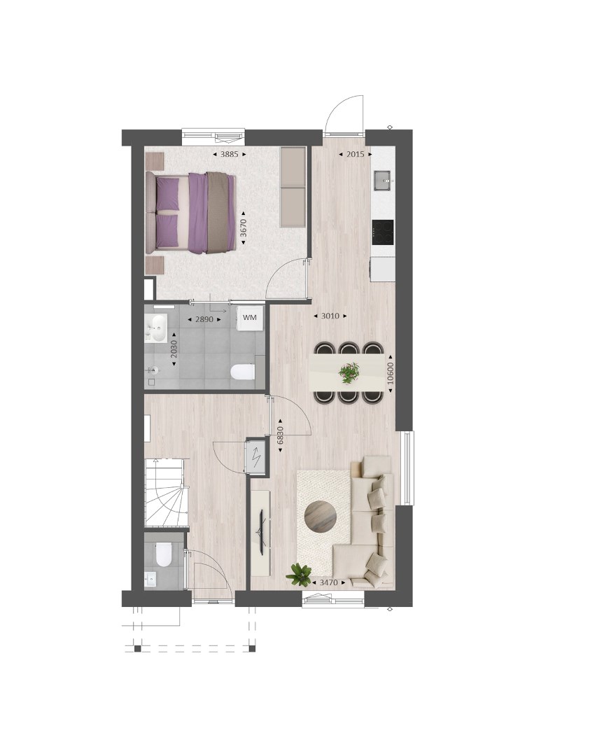 Wil je nóg meer leefruimte, dan kun je de slaapkamer bij de woonkamer voegen, kun je kiezen voor een praktische wasruimte op begane grond en een compacte doucheruimte op de verdieping met twee slaapkamers.