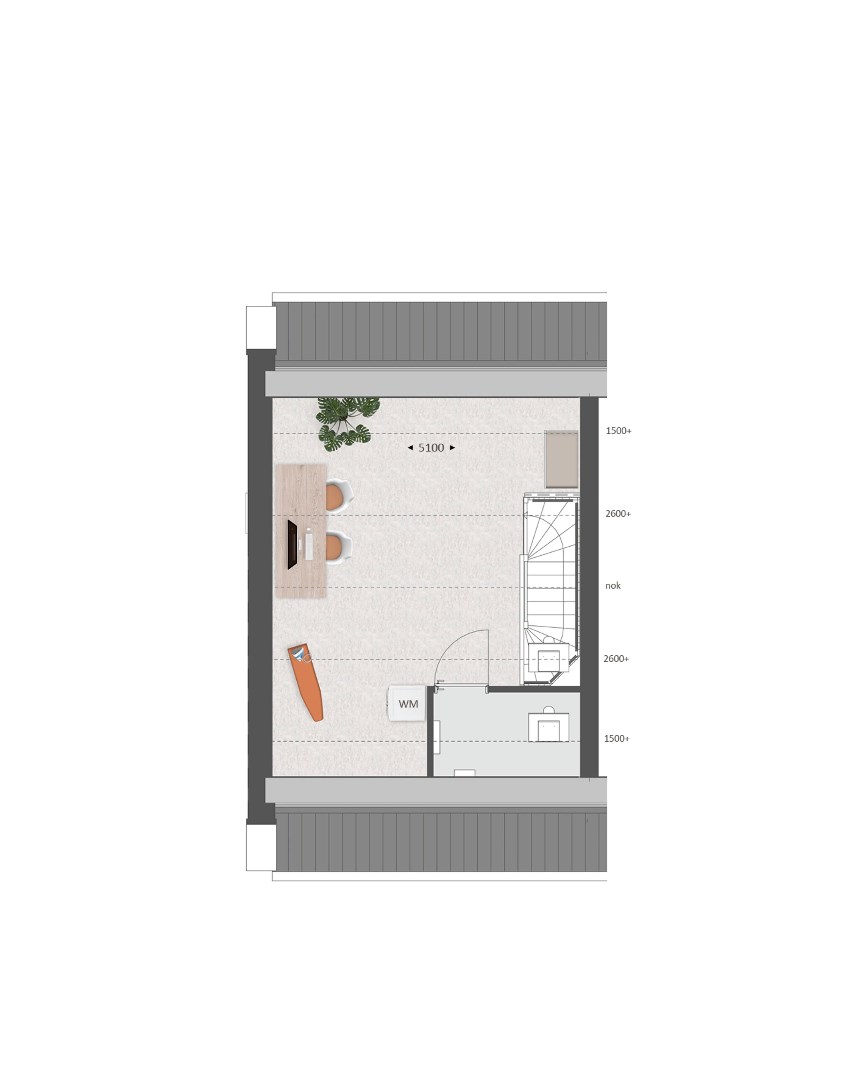 De tweede verdieping biedt je een zee aan ruimte. Hier vind je de aansluitingen voor de wasapparatuur en heb je de mogelijkheid om een aparte wasruimte te maken en een thuiskantoor of extra slaapkamer met dakkapel aan de voor- én/of achterzijde.