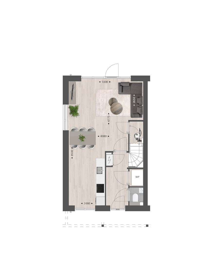 De indeling is bijzonder praktisch met beneden een hal met toilet en technische ruimte, een lichte tuingerichte woonkamer en een open keuken met zicht op de straat. TIP: Maak de woonkamer nóg groter met de optie om deze met 1.20m of 2.40m uit te breiden. De optie voor openslaande tuindeuren zorgen voor veel contact met de achtertuin.
