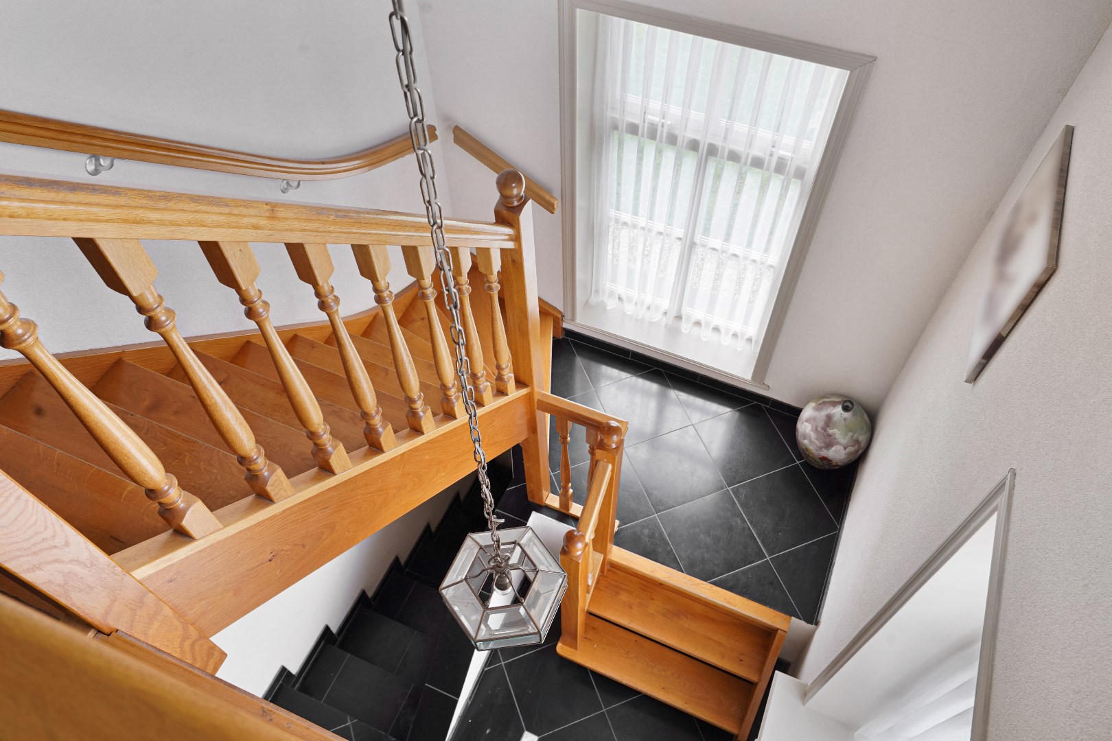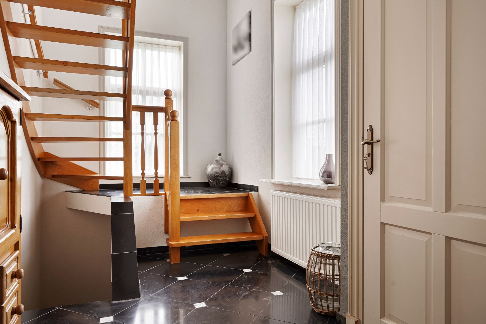 Hal met verdiepingstrap en vide, meterkast, toegang kleine kelder onder trap.