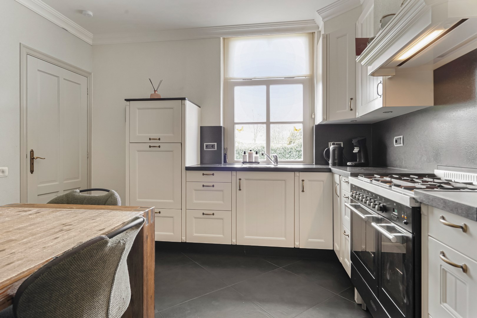 Woonkeuken met L opstelling, inbouwapparatuur en inbouwprovisiekast.