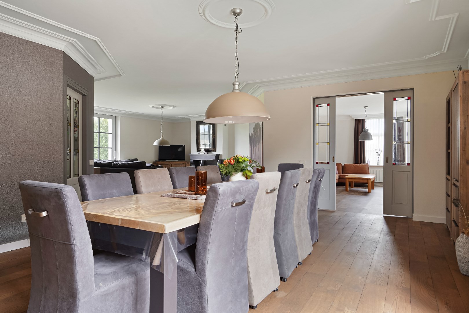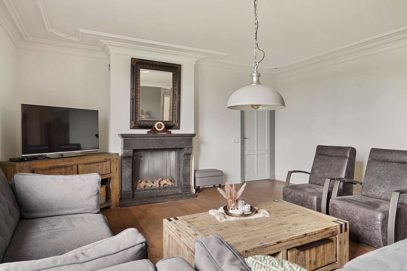 Zeer royale living met schouw voorzien van gas inbouwunit.